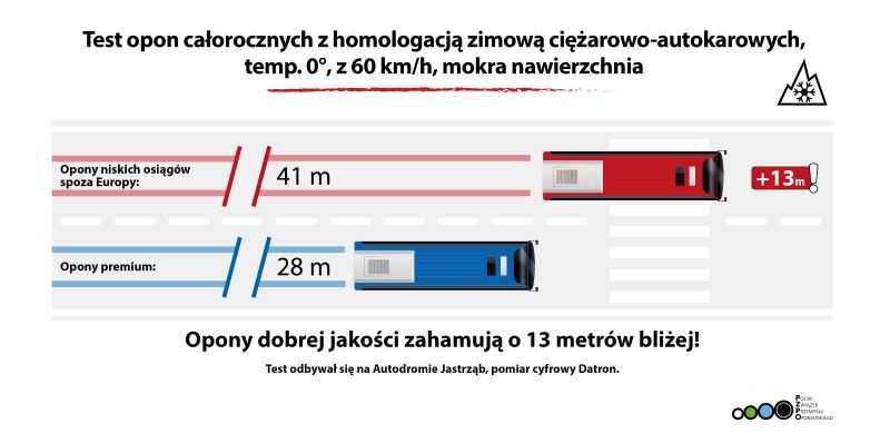 Test opon ciężarowo-autokarowych całorocznych z homologacją zimową jednoznacznie pokazuje, jak ogromne znaczenie ma jakość ogumienia dla długości drogi hamowania, a przez to dla bezpieczeństwa pasażerów lub ładunku. Opony renomowanych producentów zapewniają wyraźnie lepszą przyczepność i stabilność pojazdu niż produkty nieznanego pochodzenia i niskich osiągów. W praktyce oznacza to różnicę nawet 13 metrów na mokrej nawierzchni i to jedynie z 60 km/h – w sytuacjach awaryjnych, gdy liczy się każdy metr. Przy prędkościach, z jakimi poruszają się autokary czy ciężarówki, taka odległość może zdecydować o tym, czy pojazd zatrzyma się przed przeszkodą, czy dojdzie do wypadku. Warto podkreślić, że w przypadku autokarów stawką jest bezpieczeństwo kilkudziesięciu pasażerów – bardzo często także dzieci. Dlatego decyzje dotyczące jakości opon nie powinny być podyktowane wyłącznie ceną. Odpowiedzialność osób zarządzających flotą i stanem technicznym pojazdów jest w tym przypadku kluczowa.