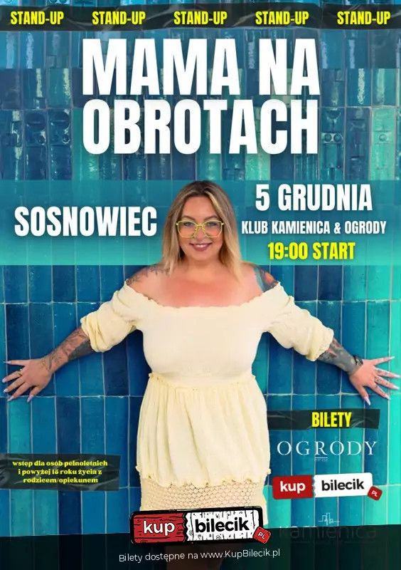 Występ wyłącznie dla osób pełnoletnich oraz od 15 roku życia za pisemną zgodą rodzica/opiekuna lub z jego obecnością. Osoby poniżej 15 r.ż. lub bez zgody nie będą wpuszczane. Podczas występu padają wulgaryzmy. Podczas występu obowiązuje całkowity zakaz nagrywania wideo i robienia zdjęć. Bilety do nabycia na: KupBilecik.plStand-up Mama Na Obrotach artyści: Klaudia Klimczyk"Mój pierwszy raz" to debiutancki i całkowicie autorski program popularnej internetowej twórczyni, w którym odnosi się do wszystkich nowych sytuacji w swoim życiu. W programie usłyszymy historie wywołujące łzy ze śmiechu, między innymi o relacji ze Starym, rodziną, fanami ale i hejterami! Nie zabraknie też tego za co pokochały ją miliony czyli kultowych strojów! Ten program to moje największe wyzwanie w życiu, ale i największa frajda. Pokochałam to i wiem, że na scenie długo pozostanę! Gdy pomyślę też, że spotkam też tak wiele osób, które na co dzień wspierają mnie w internecie, to mam łzy w oczach. Kochom Wos bo Wy mi tę siłę daliście i nie zawiodę! - mówi twórczyni własnego stand upu. Bilety do nabycia na: KupBilecik.pl |