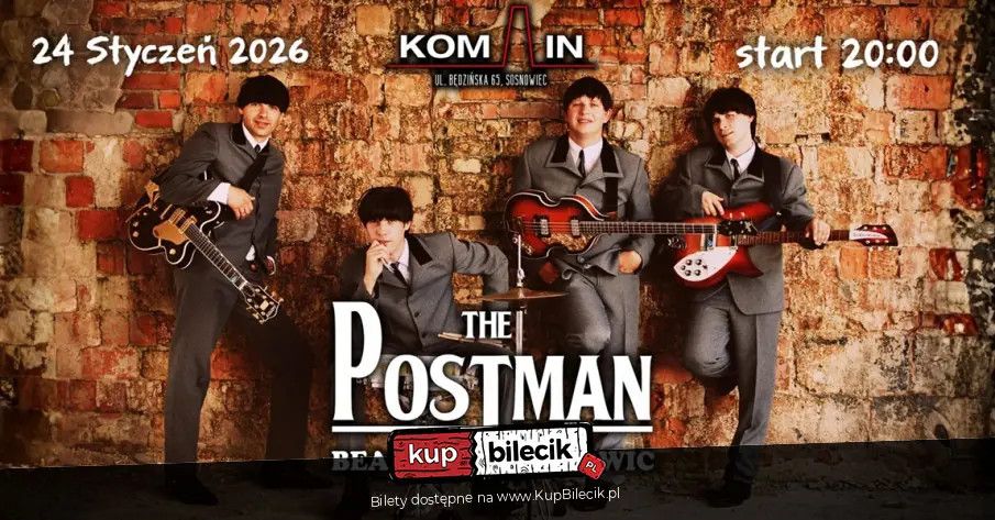 bilety: Zapraszamy na wyjątkowy wieczór z muzyką, która na zawsze zmieniła historię rocka. Na scenie wystąpi The Postman - jeden z najbardziej doświadczonych i cenionych polskich zespołów tribute The Beatles, działający nieprzerwanie od 1997 roku. The Postman to znacznie więcej niż zwykły cover band. To pełnoprawne muzyczne show, które z niezwykłą dbałością o detale oddaje brzmienie, styl i atmosferę lat 60. Zespół wykonuje największe przeboje legendarnej czwórki z Liverpoolu w autentycznych aranżacjach, z charakterystycznymi harmoniami wokalnymi, klasycznym instrumentarium i stylizacją inspirowaną epoką Beatlesów. Podczas koncertu usłyszycie m.in. takie utwory jak: Przez ponad 25 lat działalności The Postman zagrali setki koncertów w Polsce i za granicą - na festiwalach, w teatrach, domach kultury i klubach muzycznych - zdobywając uznanie zarówno wiernych fanów Beatlesów, jak i nowych słuchaczy odkrywających ich twórczość po raz pierwszy. To będzie wieczór pełen nostalgii, energii i ponadczasowych melodii, które łączą pokolenia. Jeśli kochasz klasyczny rock, historię muzyki i koncerty grane z sercem - nie może Cię zabraknąć. Do zobaczenia pod sceną w Kominie! Bilety do nabycia na: KupBilecik.plThe Postman artyści: The PostmanThe Postman to znacznie więcej niż zwykły cover band. To pełnoprawne muzyczne show, które z niezwykłą dbałością o detale oddaje brzmienie, styl i atmosferę lat 60. Zespół wykonuje największe przeboje legendarnej czwórki z Liverpoolu w autentycznych aranżacjach, z charakterystycznymi harmoniami wokalnymi, klasycznym instrumentarium i stylizacją inspirowaną epoką Beatlesów. Bilety do nabycia na: KupBilecik.pl |